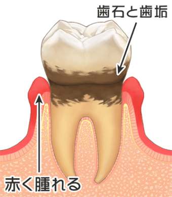 歯と歯茎の境に、お口の中の汚れ(歯垢や歯石)がついた様子です。
